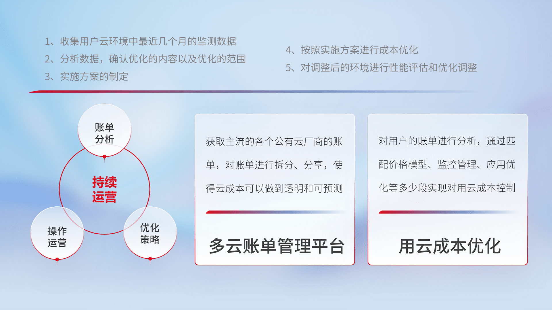 通过多云纳管,,,以统一的资源数据模型把客户的云资源进行抽象和封装,,,,进而实现对多云资源的统一操作,,,保障云资源管理的可靠性、、、稳定性与可用性。。。量身定制化运维内容,,配置、、开发运维、、补丁管理、、、备份、、监控、、认证和访问管理、、、审计和日常巡检等,,,,保障在用云过程中的可靠度,,,稳定度以及高可用率。。。
